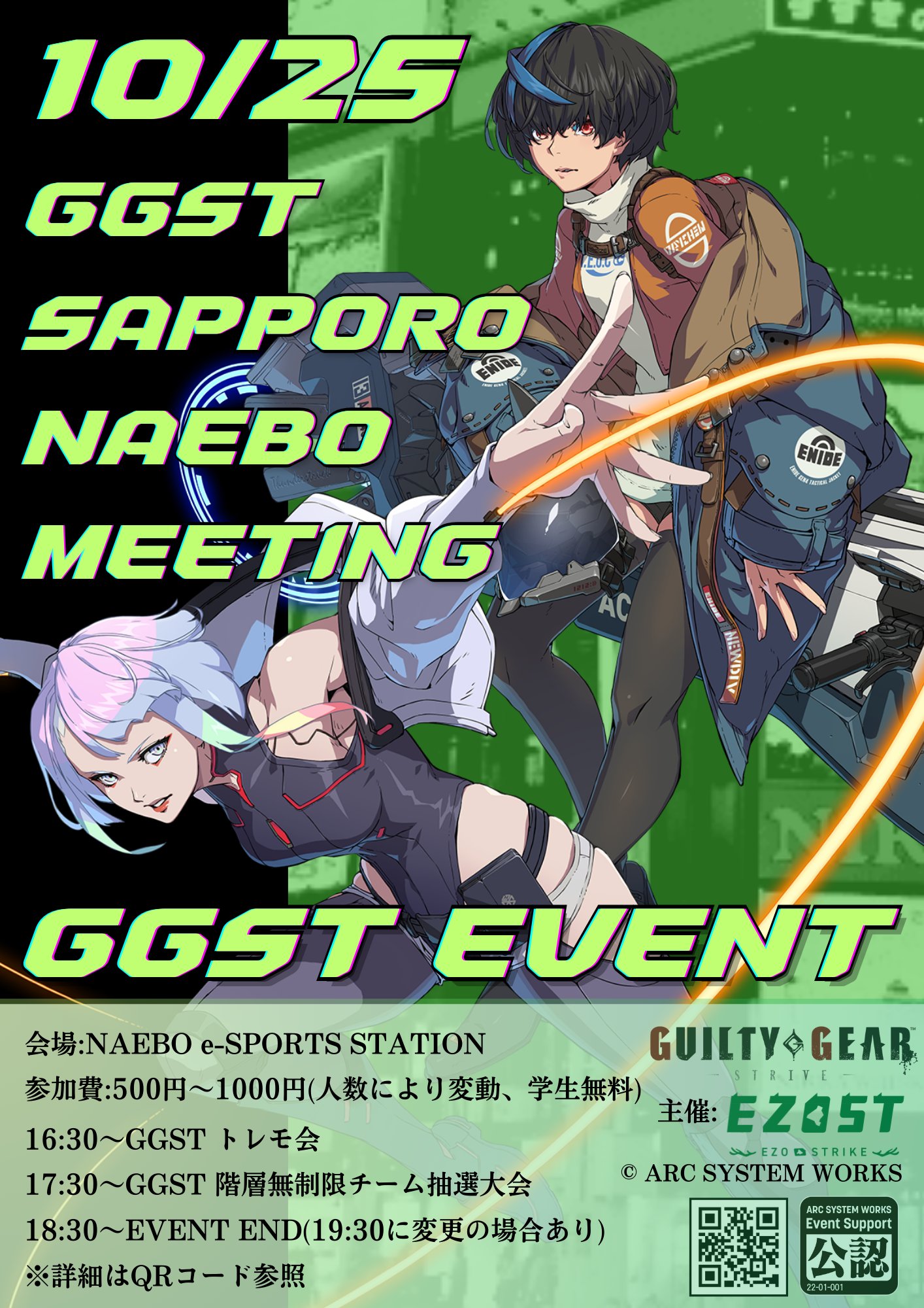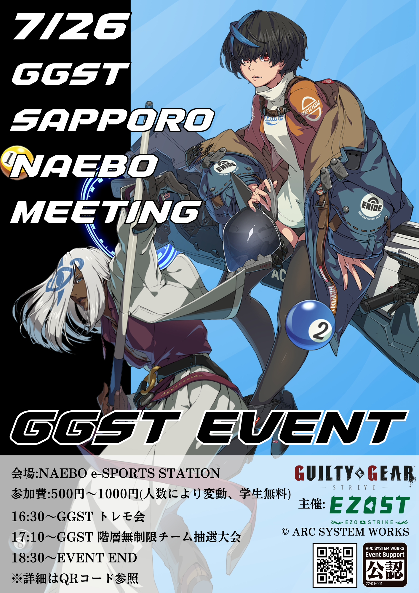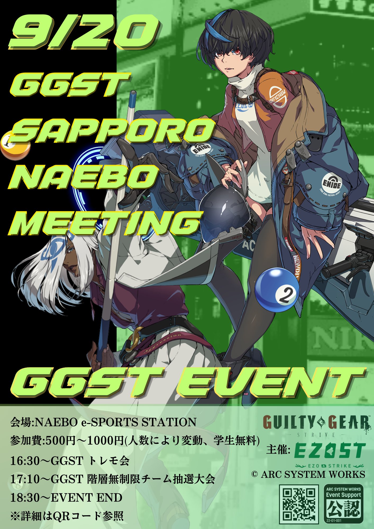 イベント概要エントリーは当日GiGO札幌駅西口店・MAXIM HEROにて受付15:45~STRIVE 初心者講習会+質問会 16:00~STRIVE トレモ会(階層無制限) & GGST 天上未経験限定対戦会(天上挑戦経験者は参加可) 17:00~STRIVE 階層無制限チーム抽選3on3 or 4on4 18:40~REV2 段位無制限チーム抽選大会 20:00~打ち上げ ※チーム大会は1人参加者チーム斡旋有 ■15:45~STRIVE 初心者講習会+質問会 【 当日受付 】受付なし。当日自由に参加可能。 【 参加費 】無料。 【イベント形式】 当日初心者向けの講習会を開催。 参加者いた場合のみ開催。 講師:Headless チップ使い(8~10階層) ウイスキー大好き陽気なアメリカ人。 3Dアートが趣味。 日本語が得意。英語を教えられる。 講師:えめ ブリジット(天上階)、梅喧(天上階)、闇慈使い(10階層) 酒が強い。スプラ〇ゥーンにはまっている。 講師:みんみ ポチョ使い(10階層) バイクが好き。元ラグビー部。 講師:よこち メイ使い(天上階) ベーシスト。ギタリスト。 運営:にしこうき 新規初心者向けイベントも含めて 二十年ぐらいイベントを運営。 ■16:00~STRIVE トレモ会 & GGST 天上未経験限定対戦会(天上挑戦経験者は参加可能) 【 当日受付 】受付なし。当日自由に参加可能。 【 参加費 】自費。1クレジット100円。 【イベント形式】 ・トレモ会 トレーニングモードで行う練習会・情報交換会 ・GGST 天上未経験限定対戦会(天上挑戦は含まない) 参加者の段位を見て2~3台の専用台を設置。 適正なレベルではないと判断した場合は声かけて移動してもらう場合有。 ■17:00~STRIVE 階層無制限チーム抽選大会 【 当日受付 】16:30~予定 【 参加費 】200円 【 大会形式 】 できるだけ高階層の人が固まらないようチームを抽選等で予定。1人参加者運営にてチーム斡旋有。 ■18:40~REV2 段位無制限チーム抽選大会 【 当日受付 】18:10~予定 【 参加費 】200円 【 大会形式 】 できるだけ高階層の人が固まらないようチームを抽選等で予定。1人参加者運営にてチーム斡旋有。 ■20:00~打ち上げ 【 当日受付 】20:00~予定 【 予算 】3000~4000円予定 【 詳細 】 注意事項イベント開始時間は予定より遅れる場合があります。場合により内容変更や中止、延期になる場合があります。 主催・運営:EZOST |